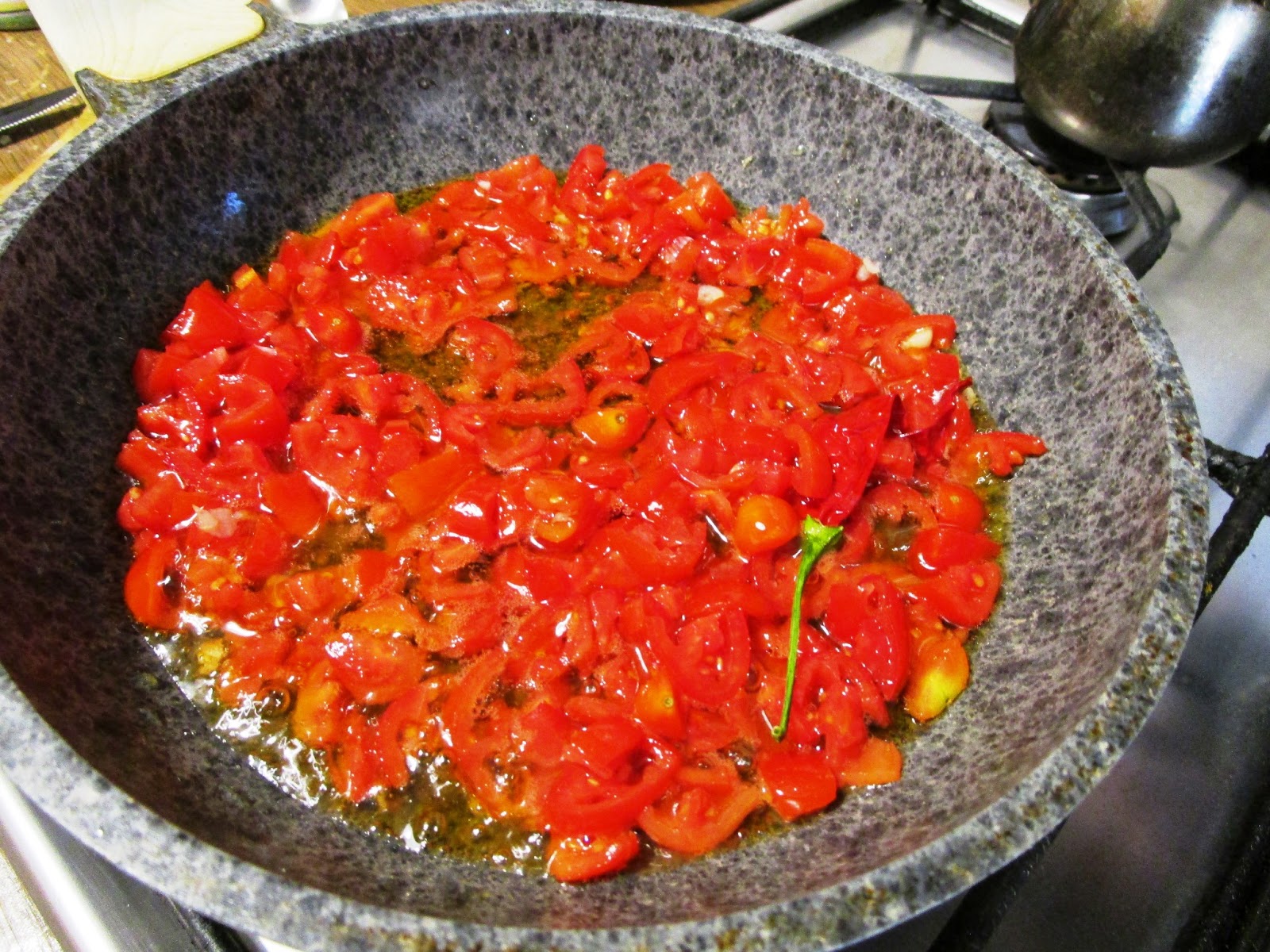 - in una larga padella antiaderente mettere 3 cucchiai d'olio e gli ortaggi e rosolare, a fuoco basso,