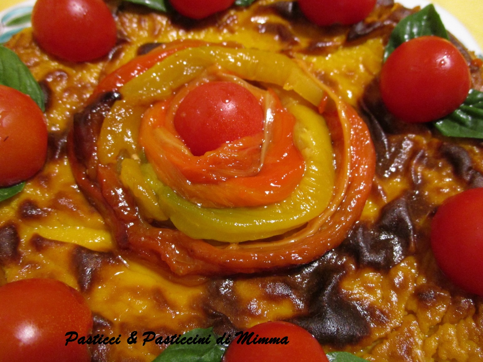 - con delicatezza, trasferire il gateau su un piatto da portata e decorare con le falde dei peperoni, i pomodorini e le foglie di basilico